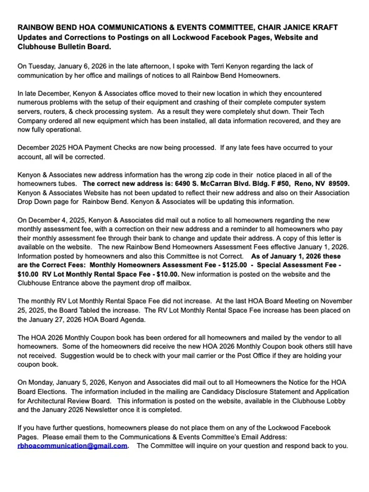 If you have any questions, please submit your questions in writing. If you place your questions on any of the Lockwood Facebook Sites, they will not be addressed by the HOA Board. Email your written request to Kenyon and Associates - terri@kenyonandassociastes.com & Melissa Turner - assistants@kenyonandassociates.com or Drop off your written request at the Patrol Office. updated 1-5-26